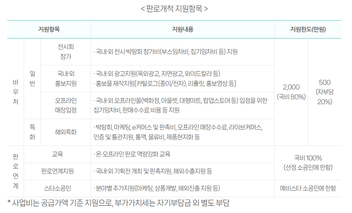 국비 2,000만원 한도 내 바우처항목 선택 및 판로연계지원 등