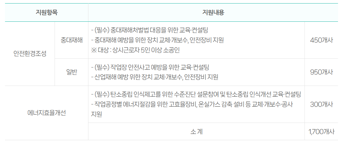 * 안전환경조성 1,400개사(중대재해 450개사, 일반 950개사), 에너지효율개선 300개사 내외
